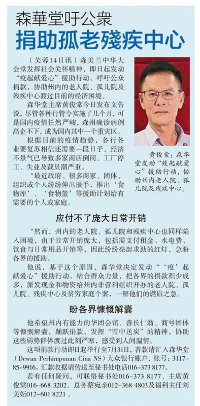 他说,基于这个原因,森华堂决定发动“‘疫’起献爱心”援助行动,结合群众力量,把各界的捐款积少成多,派发现金和物资给州内非营利组织开办的老人院、孤儿院、残疾中心及贫穷家庭个案,一解他们的燃眉之急。
