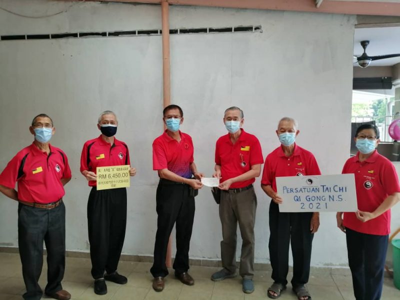 (图)森州太极气功十八式各花园联合会为“疫“起献爱心运动筹获 RM 6,450,由会長徐荣福(右三)代表移交支票予森华堂主席黄俊棠(左三)接領。左起为谭国祥、郑文祥,右起邓淑莲、蔡兴。