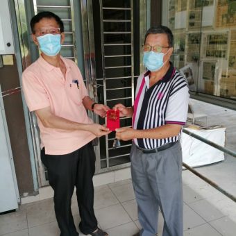 (图)热心人士李科移交RM1000捐款予森华堂主席黄俊棠接领。