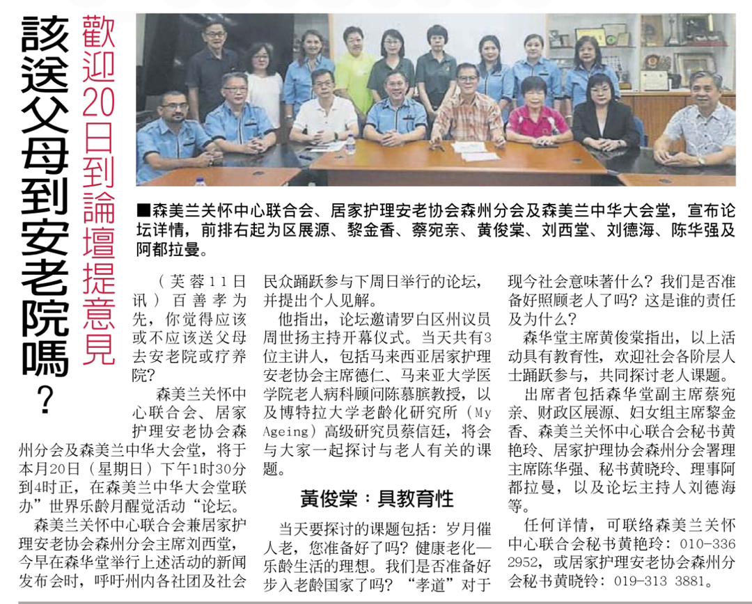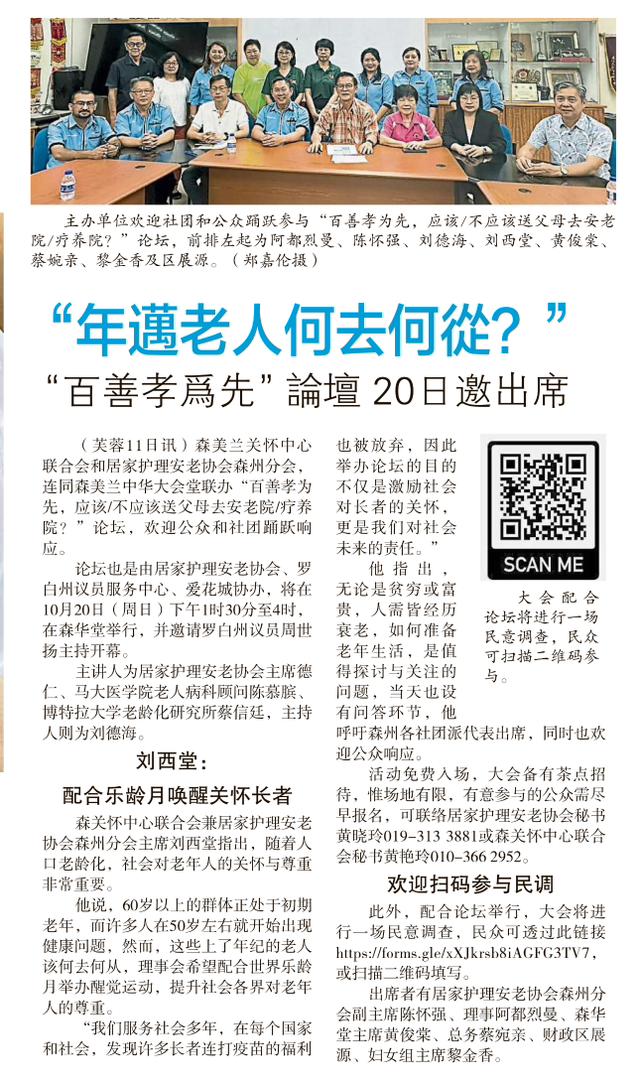 配合世界乐龄月觉醒活动的“百善孝为先,你觉得应该或不应该把父母送进安老院或疗养院?”论坛活动定于10月20日(星期日)举行,呼吁社团代表与民众踊跃参与其盛。