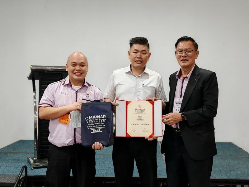 黄俊棠(右)和李欣峰(左)一同颁发感谢状和纪念品予闭幕嘉宾朱建华州议员(中)。
