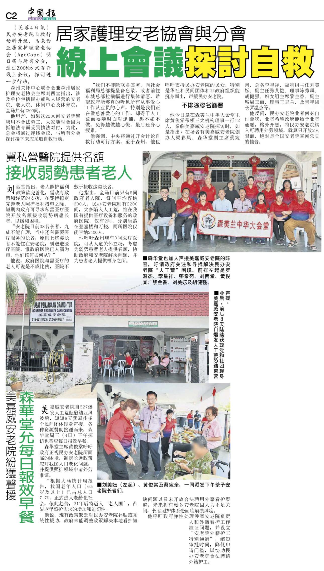(芙蓉4日讯)美嘉威安老院自527爆发人工荒酝酿结业风波后,短短8天获森州多个民间团体现身声援,各种资源赞助接踵而来,森美兰中华大会堂于周三(6月4日)下午探访也答应每日报效早餐。