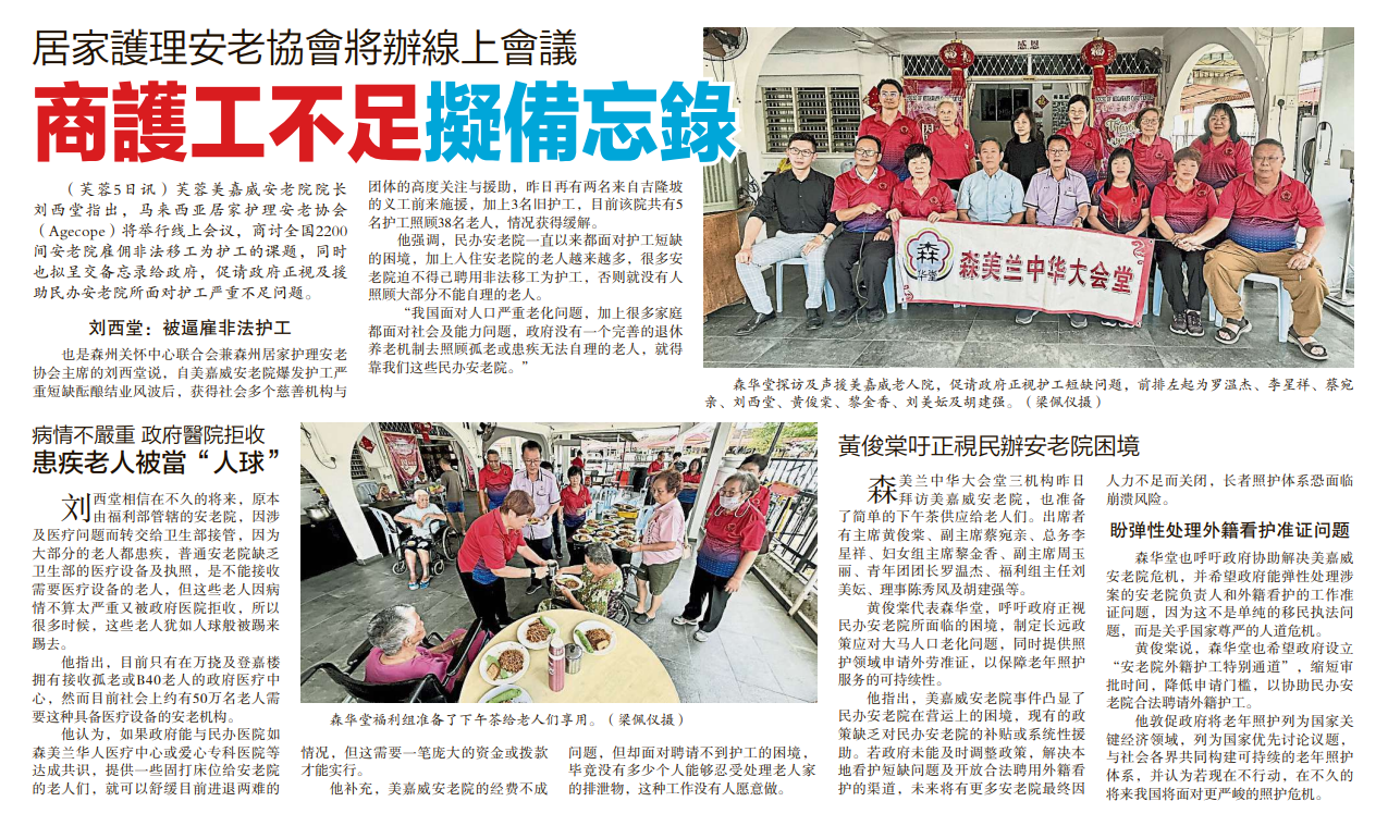 森华堂主席黄俊棠呼吁政府正视民办安老院所面临的困境,制定长远政策应对我国人口老化问题,并提供照护领域申请外劳准证。