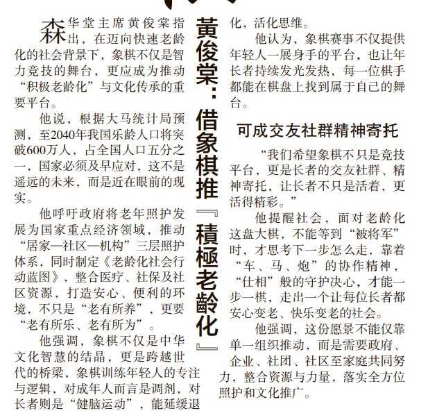 他提醒社会,面对老龄化这盘大棋,不能等到“被将军”时,才思考下一步怎么走,靠着“车、马、炮”的协作精神,“仕相”般的守护决心,才能一步一棋,走出一个让每位长者都安心变老、快乐变老的社会。