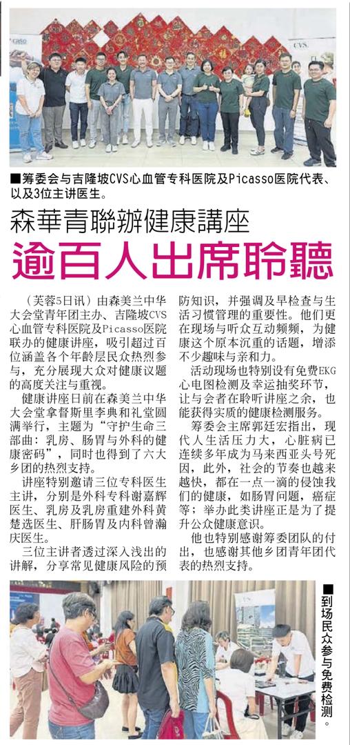 由森美兰中华大会堂青年团主办、CVS KL心血管专科医院及Picasso医院联办的健康讲座《守护生命三部曲:乳房、肠胃与外科的健康密码》,于2025年8月2日(星期六)下午在森美兰中华大会堂拿督斯里李典和礼堂圆满举行。