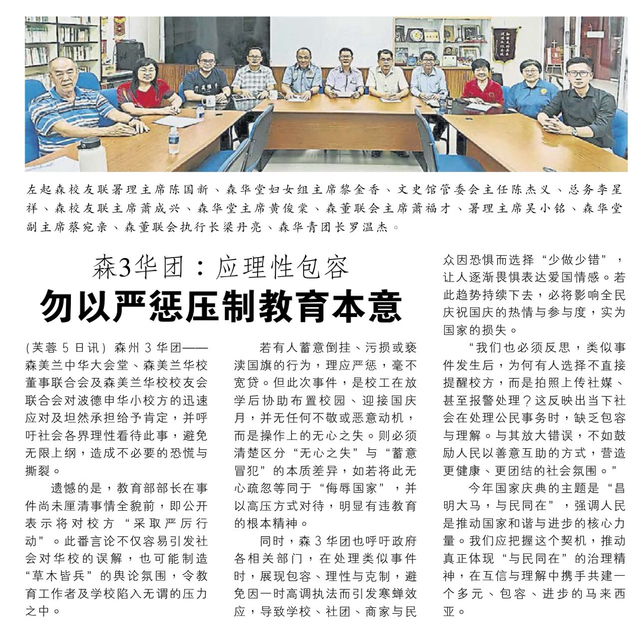 近日,波德申中华小学因校工在放学后协助布置校园时,误将一面国旗倒挂,引发社会关注。校方在第一时间发现问题后,已迅速将国旗取下并公开致歉,展现了应有的责任感与担当,并未有丝毫推卸之意。森州三华团 – 森美兰中华大会堂、森美兰华校董事联合会及森美兰华校校友会联合会对校方的迅速应对及坦然承担给予肯定,并呼吁社会各界理性看待此事,避免无限上纲,造成不必要的恐慌与撕裂。