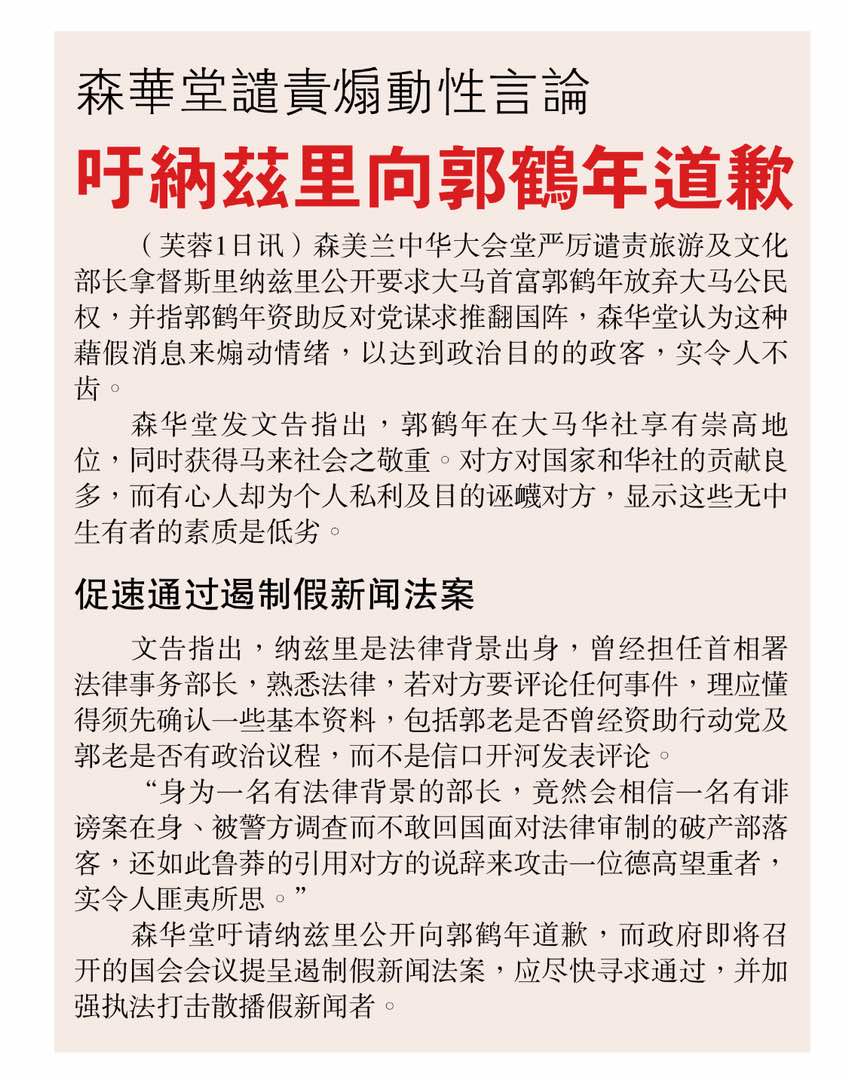 森华堂谴责煽动性言论,吁纳兹里向郭鹤年道歉(1-3-2018)