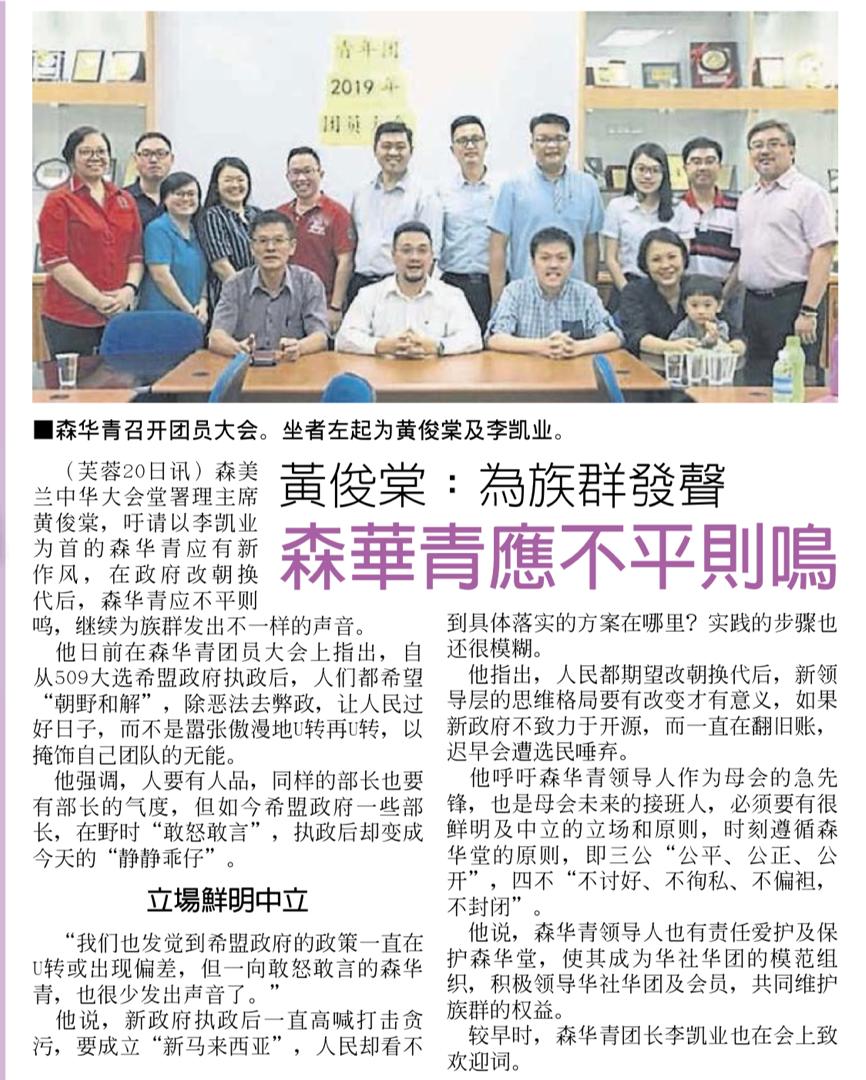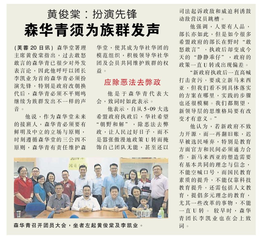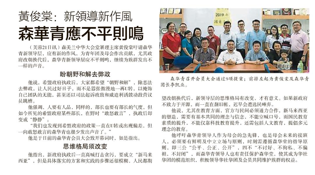 (芙蓉20日讯)森华堂署理主席黄俊棠吁请森华青以李凯业为新任团长的新领导层,应有新的作风,并为青年团及母会作出贡献,尤其政府改朝换代后,森华青新领导层应不平则鸣,继续为族群发出不一样的声音。他是在森华青团员大会上作出上述呼吁。