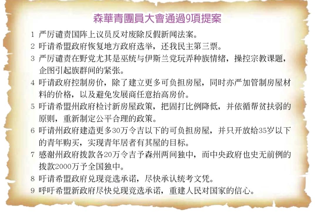 较早时,森华青团长李凯业也在会上致欢迎词。团员大会上也通过9条提案如下: